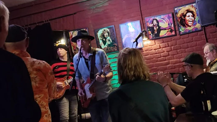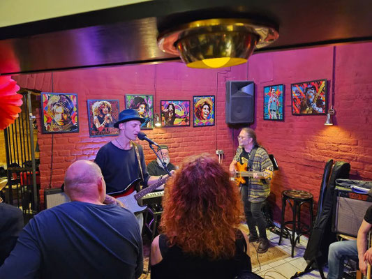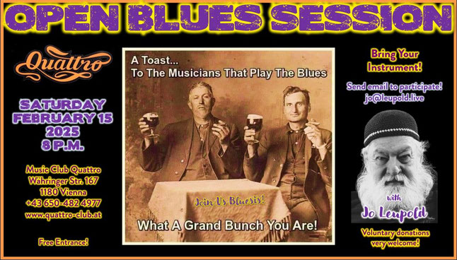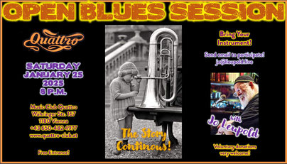 Grandiose Stimmung bei Jo's Session im Februar mit Tamás Erky (sax), Nico Tanzarelly (git), Joe Schirl (bass), Hari Kreuzer (drums) und Jo Leupold (piano & vocals). Weitere fantastische Beiträge lieferten Sebastian Schmidt (git & vocals), Georg Berner (bass), Alex Kochmann (git), Michael Groschner (sax) und Erwin Peherstorfer (git & vocals).