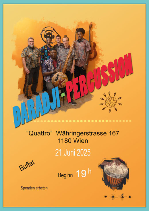 Daradji Percussion: Afro, Reggae & Mbalax Marimba mit Ibou Ba (vocals & perc), Kemo Sissoko (kora), Jo Rameder (bass), Fabien Lehner (keys), Tamor Samb (perc), Makus Gruber (drums).